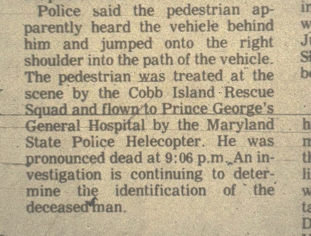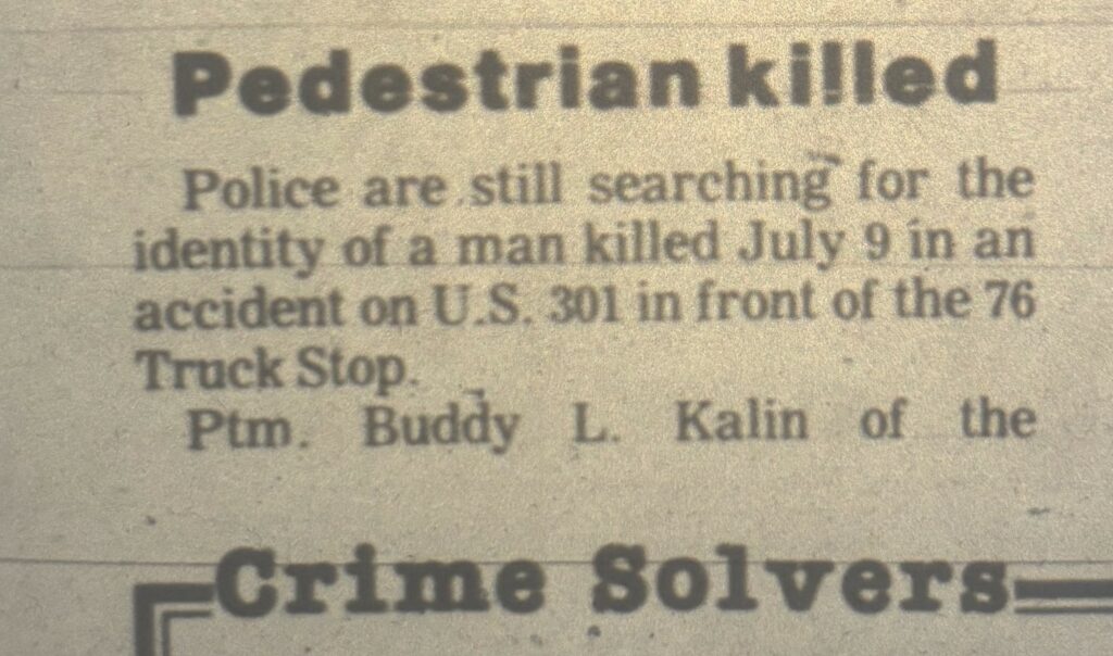 Detectives with the Charles County Sheriff’s Office are seeking the identity of a man who was fatally struck by a vehicle more than four decades ago and whose identity remains unknown. On July 9, 1983, officers responded to a report of a motor vehicle collision involving a pedestrian on southbound Crain Highway in the area of the truck stop near the then Harry Nice Bridge. The pedestrian was transported to a hospital but was pronounced deceased due to his injuries. The driver involved in the collision remained on the scene and fully cooperated with officers. A preliminary investigation revealed the pedestrian was walking in the travel portion of Crain Highway at the time he was struck. Officers canvassed the area along Crain Highway and found witnesses who interacted with the man earlier; he indicated he was traveling, possibly to North Carolina.